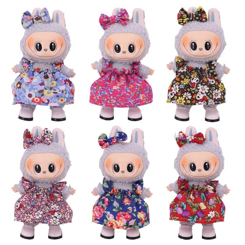 • Floral Party Dress & Bowknot Headband for 17cm Labubu Mini Figure - Lightweight Cotton-Blend Outfit, Easy-Dress Design