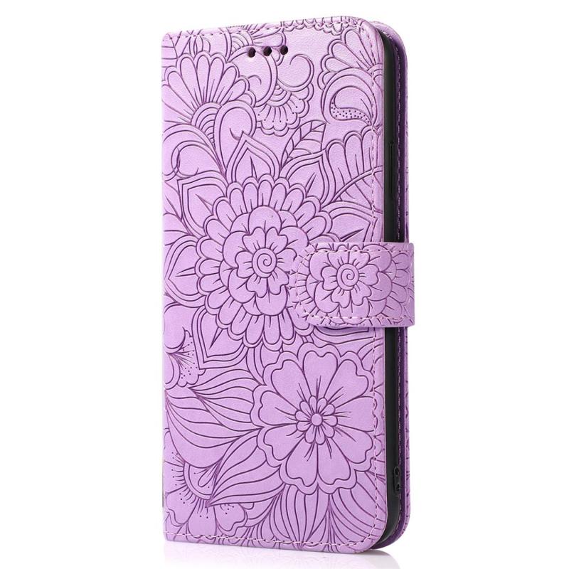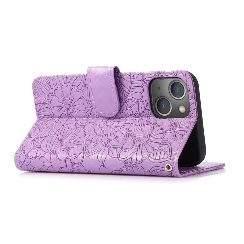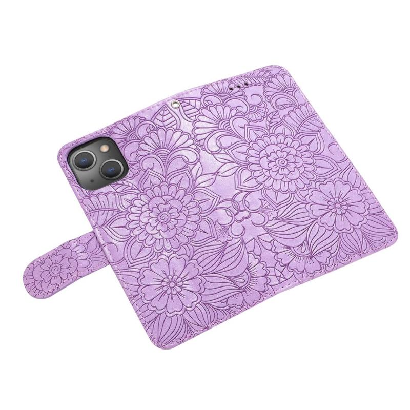 For iPhone 14 Plus PU Leather Phone Shell Stand Multifunction Wallet Imprinted Flower Pattern Phone Case with Strap