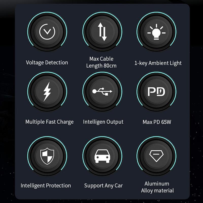 The GC08A Car Charger merges convenience, style, and efficiency in one compact design. Its dual retractable cables prevent cable chaos, while the comprehensive charging protocols cover nearly any device you own. Real-time voltage monitoring and robust safety measures protect both your vehicle and your devices. Combined with eye-catching ambient lighting, it’s the complete upgrade for anyone seeking a next-level in-car charging solution.