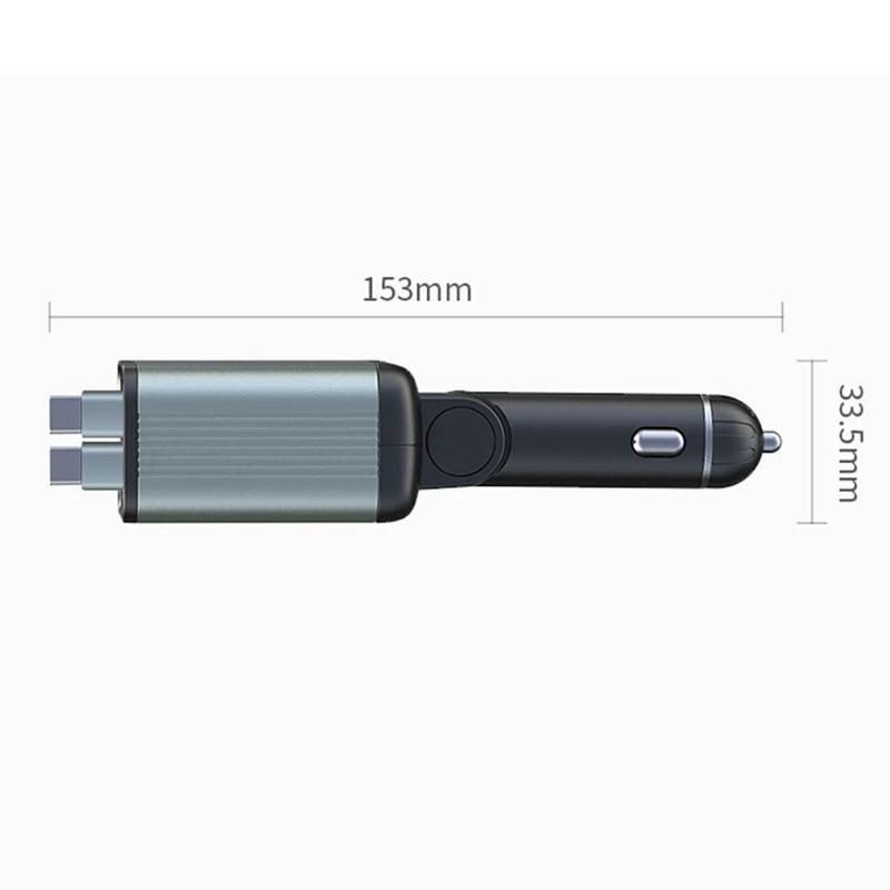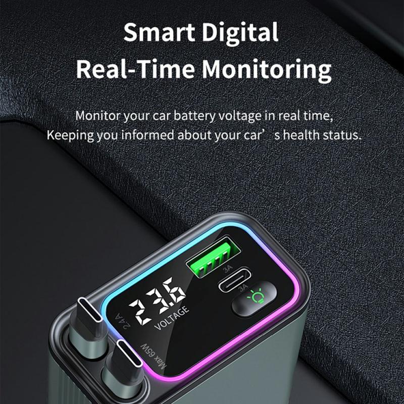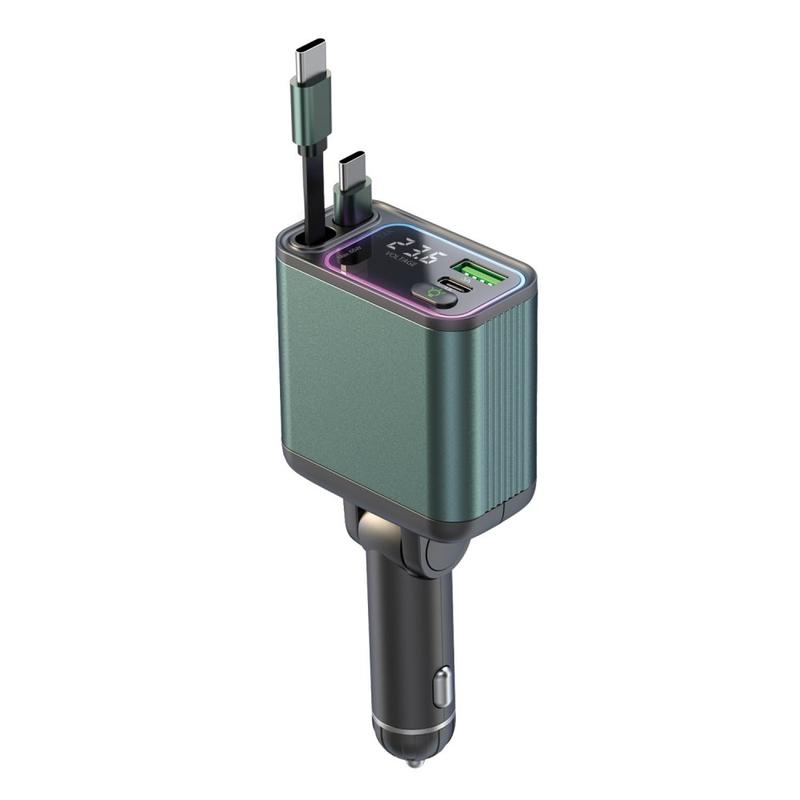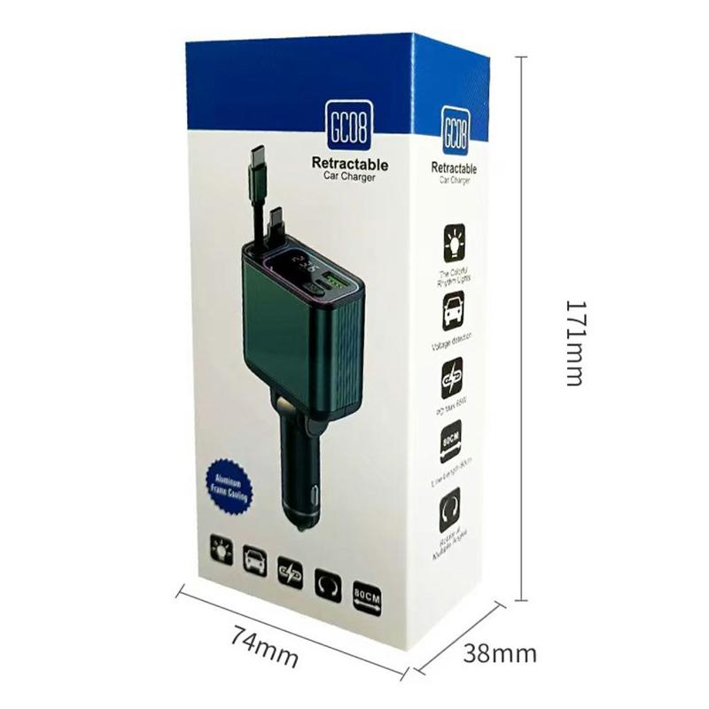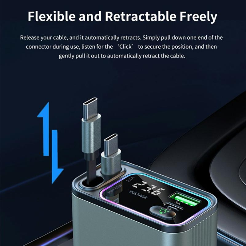 GC08A Car Charger with Ambient Lighting, Voltage Display, Dual Type-C Retractable Cables, USB-C and USB-A Ports