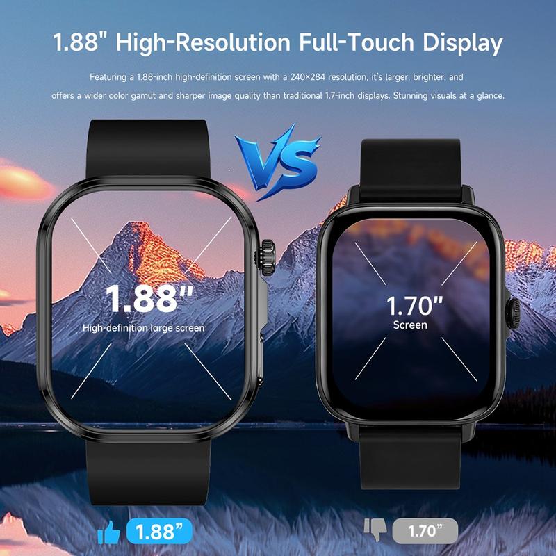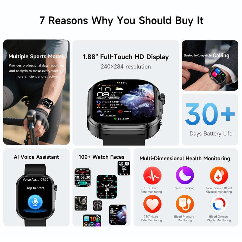 The GE52 smart watch combines advanced health monitoring with modern convenience, offering ECG measurement, heart rate tracking, blood oxygen detection, temperature monitoring and more—all from your wrist. Its large 1.88-inch HD display provides crisp, vibrant visuals that surpass traditional 1.7-inch screens, making daily use clearer and more enjoyable.