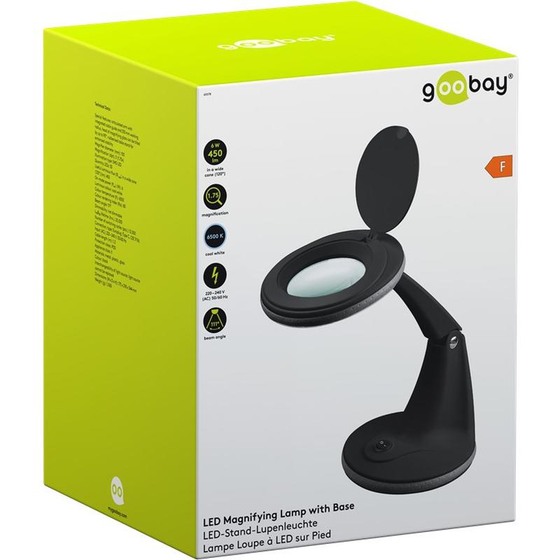 Goobay LED Magnifying Lamp with Base – 6W Ring Light, 100 mm Glass Lens, 1.75x (3 Dioptres), 450 lm, 6500K Cool White, Adjustable Arm (Black)