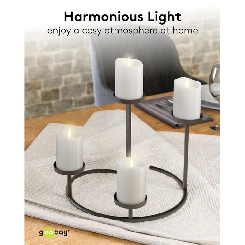 Add classic candlelight charm to any space with this set of 4 Goobay LED Real Wax Candles. Crafted from genuine wax and equipped with 3D flame cones, they create a beautifully realistic flickering effect that captures the warmth of traditional candles—without soot, heat or fire hazards. The warm white 2700 K glow provides a cosy atmosphere suitable for year-round décor, from intimate dinners to festive Christmas celebrations. With an automatic 6-hour timer and battery operation, these candles offer effortless ambience wherever real flames may be unsafe or not permitted.