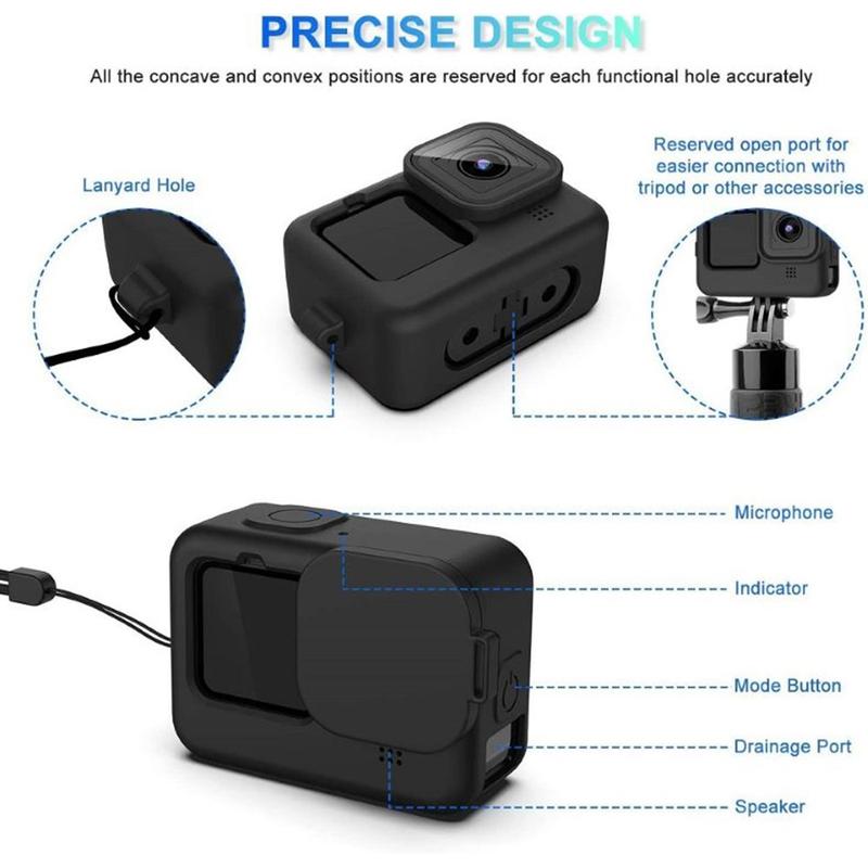 Silicone sleeve protective case + adjustable lanyard + lens cover, sleeve used to protect it from scratches, a hole on the charger side makes it convenient to charge even if it is sleeved on