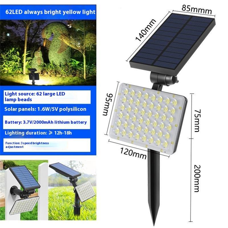 Upgrade your outdoor space with this 62 LED Solar Ground Spike Light and enjoy elegant, cost-effective illumination for gardens, walkways, and beyond. Experience versatile brightness levels, extended battery life, and effortless solar recharging for all your outdoor lighting needs.