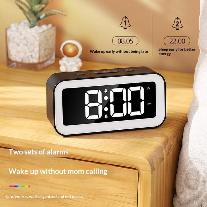 The GS202-2 digital alarm clock features a vivid RGB dynamic color display combined with an ambient night light for a modern desk or bedside setup. Choose from 4 fixed colors or 3 dynamic RGB modes to match your room style.