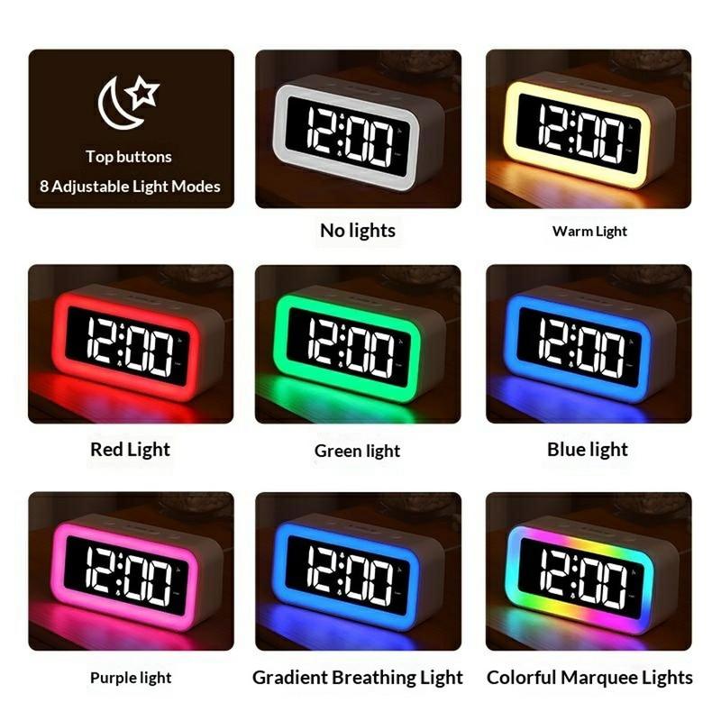 The GS202-2 digital alarm clock features a vivid RGB dynamic color display combined with an ambient night light for a modern desk or bedside setup. Choose from 4 fixed colors or 3 dynamic RGB modes to match your room style.