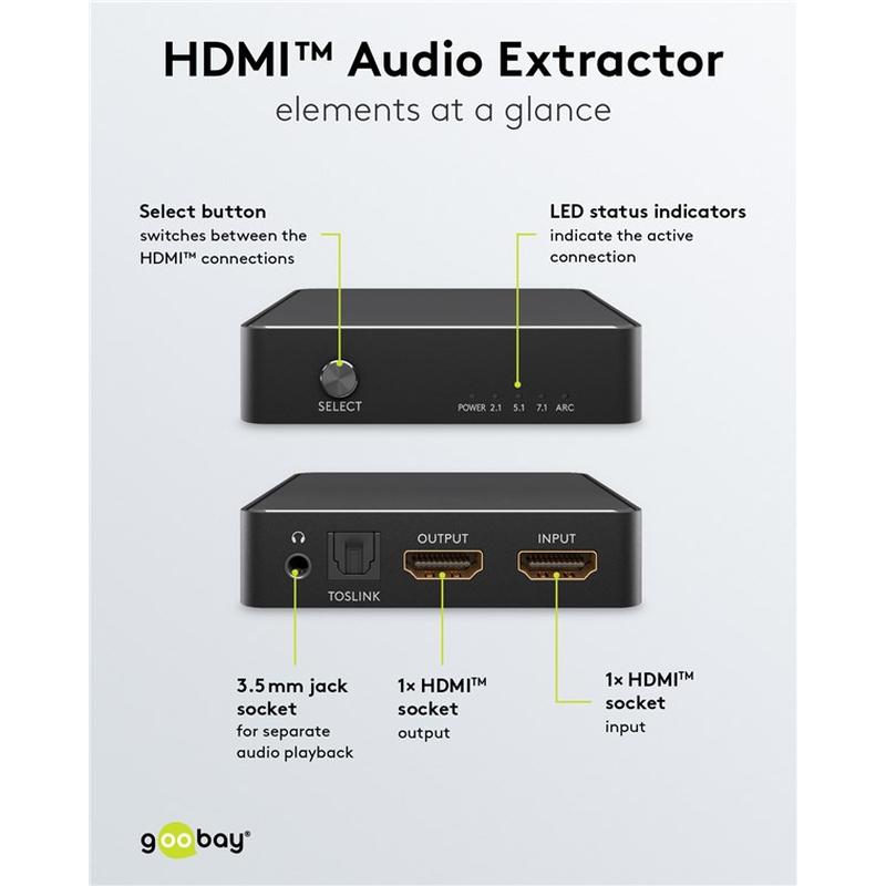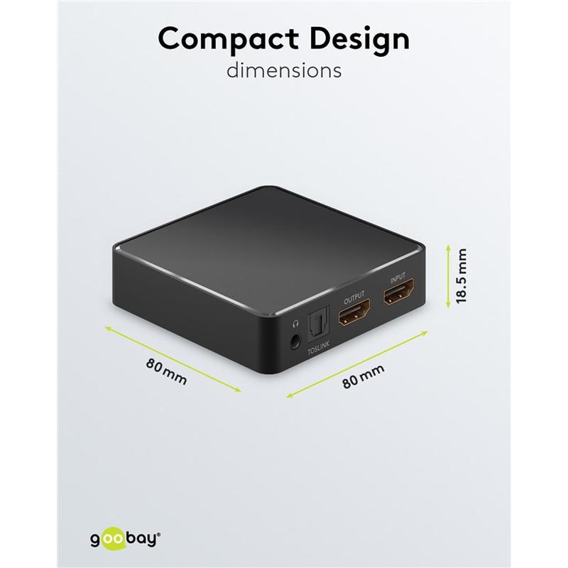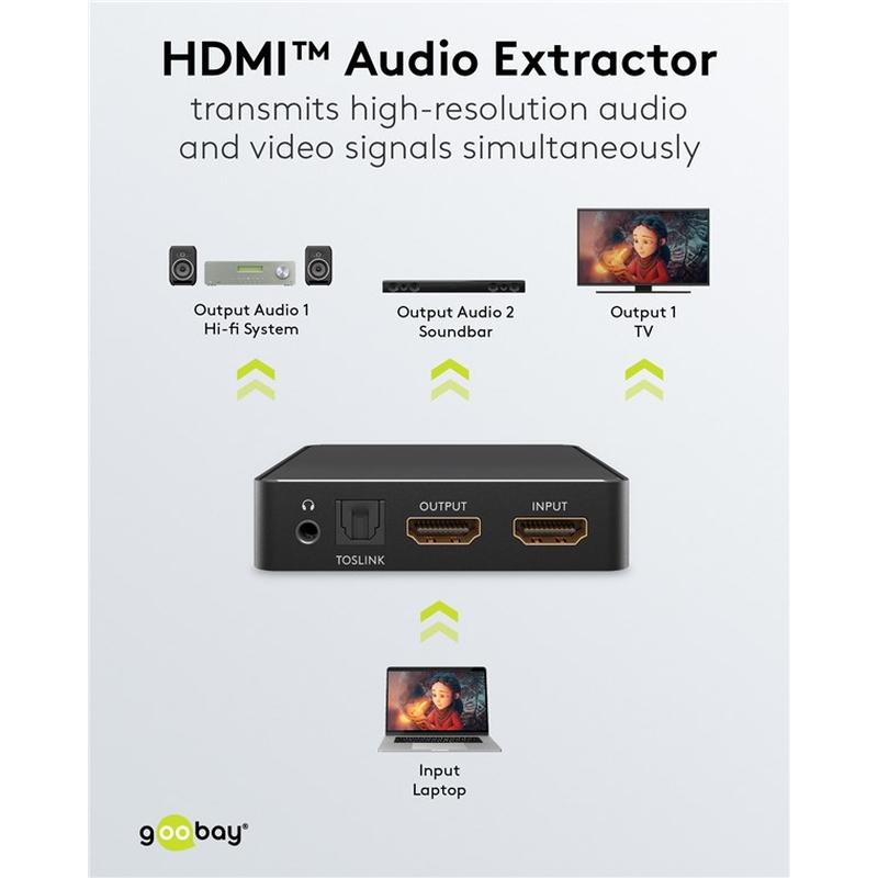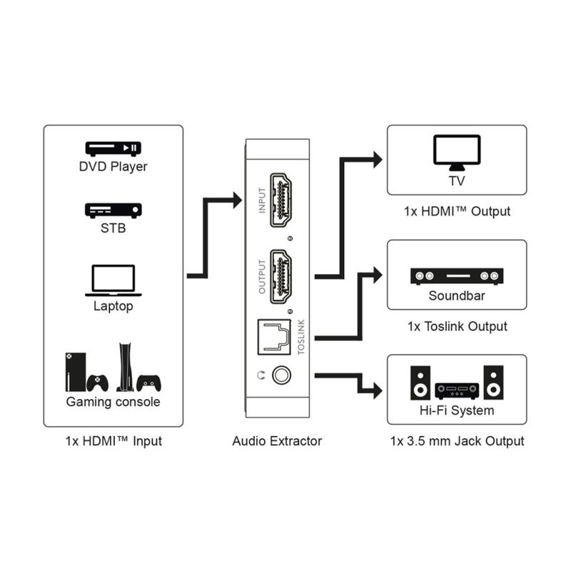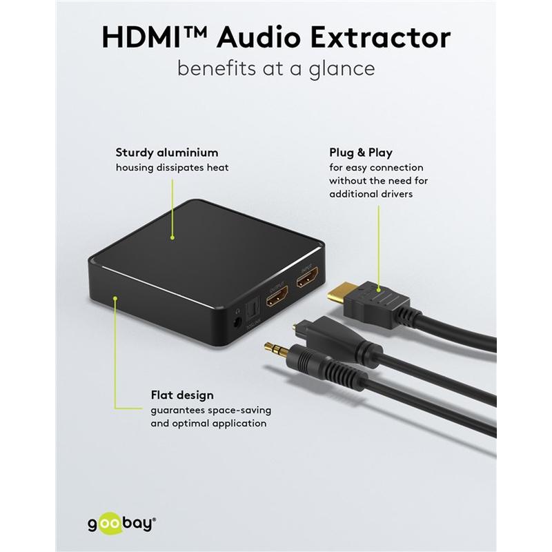 HDMI™-omvandlaren skickar den bästa digitala och analoga ljudkvaliteten till enheter utan egen HDMI™-anslutning, t.ex. hörlurar, hifi-anläggning, soundbar eller TV. HDMI™-splitter omvandlar den inkommande digitala HDMI™-ljudsignalen till en analog stereosignal för anslutna slutenheter. Via HDMI™-udgangen opnår HDMI™-ljudextraktoren en videoopløsning på maks. 4K2K @ 30 Hz og understøtter også 3D. Plug & Play gör det enkelt att ansluta S/PDIF-splittern utan att installera ytterligare drivrutiner. Robust aluminiumhölje som släpper ut värme och gör det enkelt att hantera kablar tack vare anslutningarna på baksidan. Utrustad med guldpläterade kontakter för korrosionsskydd och högkvalitativ signalöverföring