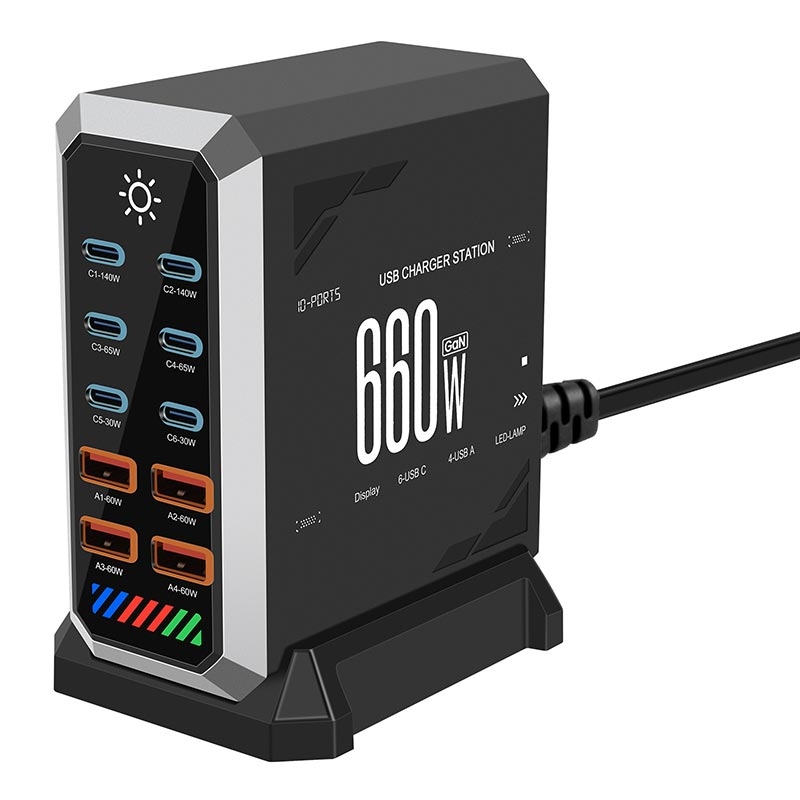 HHW HW18 660W GaN Multi-Port Desktop Charger - Smart USB Power Adapter Station with Digital Display - 6xUSB-C, 4xUSB-A