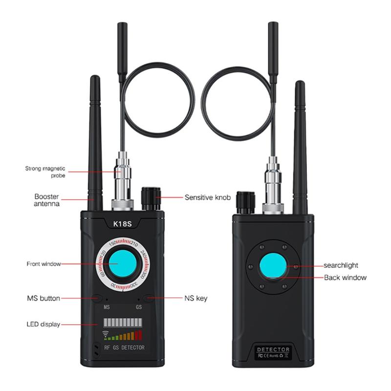 RF detectors like the K18s use radio frequency scanning and optical lens filters to identify hidden devices. The red light reflection method used in lens detection is similar to techniques applied in professional counter-surveillance operations.