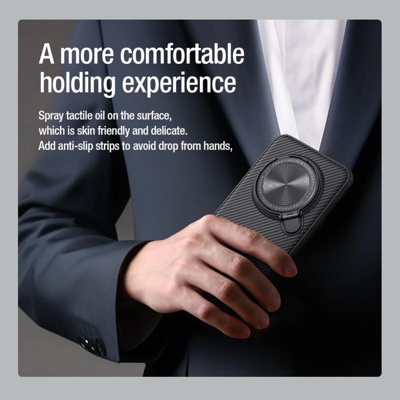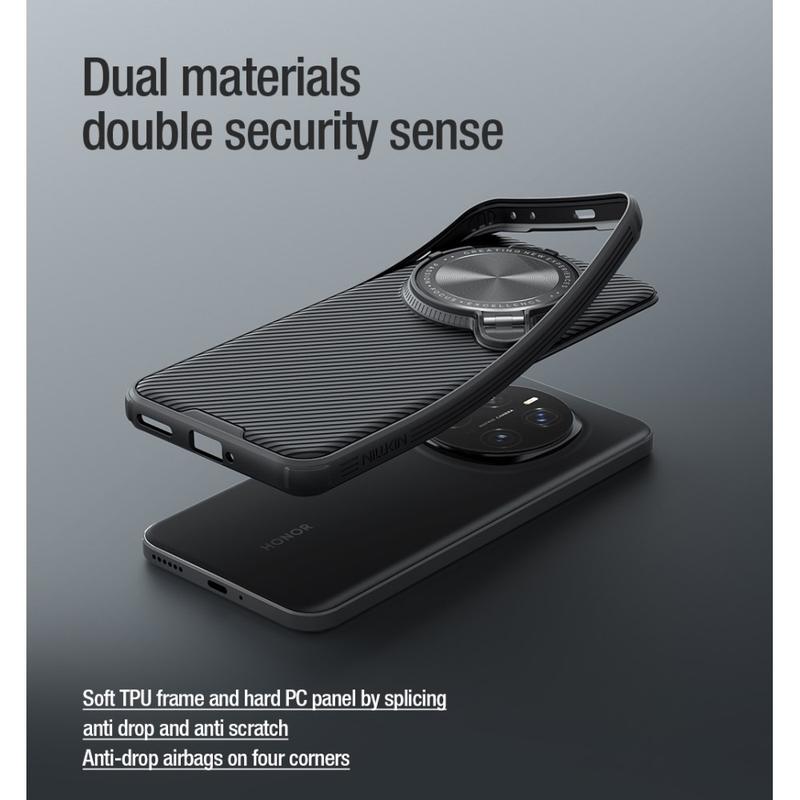 Protect your Honor Magic7 Pro with the Nillkin Camshield Prop series case. Crafted from a durable TPU and PC hybrid, this case provides superior protection against daily damage. The classic twill texture offers a comfortable, anti-skid grip, while built-in MagSafe compatibility ensures seamless wireless charging. A metal lens frame kickstand adds extra protection for your camera and provides hands-free viewing convenience. Non-slip bars and raised lips protect your Honor Magic7 Pro while maintaining easy access to all ports and functions.