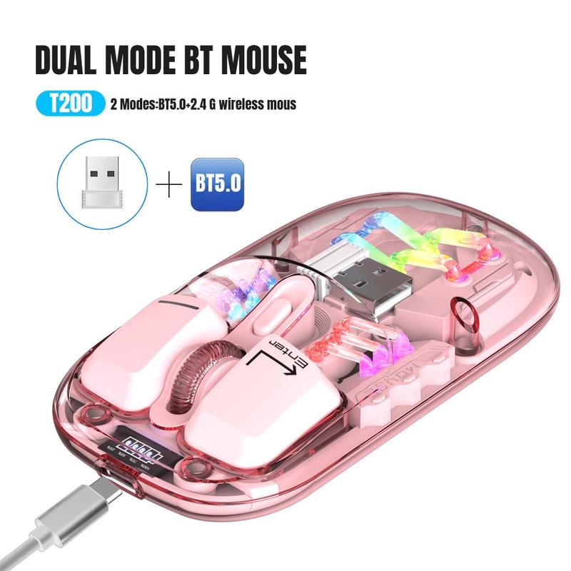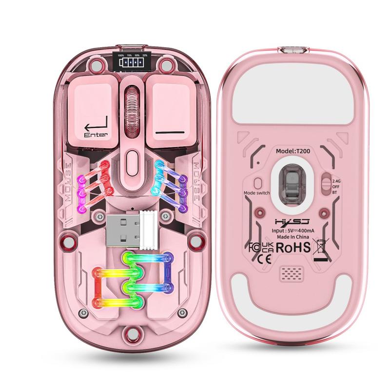 The HXSJ T200 Wireless Bluetooth Mouse offers dual connectivity via Bluetooth and 2.4GHz wireless, supporting simultaneous connections to two devices. Crafted from transparent PC material with customizable RGB lighting, this mouse delivers a high-end look and superior functionality. With adjustable DPI (800/1200/1600), a long-lasting 400mAh rechargeable battery, and a sleek ergonomic design, it ensures precise and smooth operation. Ideal for both work and gaming, the mouse enhances efficiency and comfort with silent clicks and vibrant lighting.