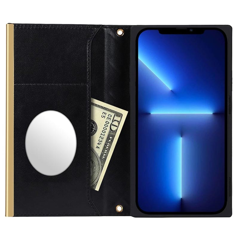Round up your outfit with this luxury protective case for your iPhone 13 Pro Max. Designed like a small, fashionable purse, this wallet case features a convenient inner pocket and a small mirror that comes in handy to fix your makeup during a daily rush. Thanks to high-quality polyurethane, and shockproof TPU, this wallet case provides excellent all-around protection from daily damage and enables you to carry your essentials along with your iPhone 13 Pro Max.