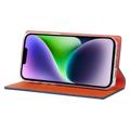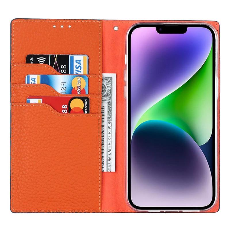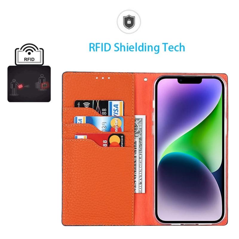 For iPhone 14 RFID Blocking Card Slot Wallet Phone Case Litchi Texture Genuine Leather Stand Auto-absorbed Protective Cover