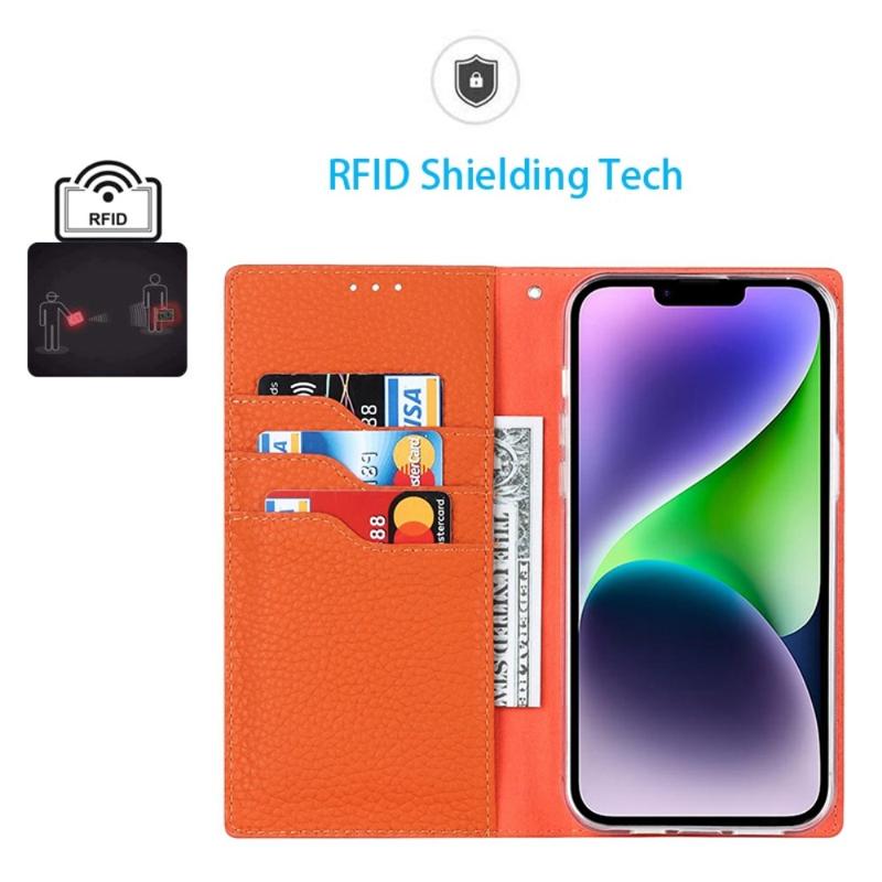 For iPhone 14 RFID Blocking Card Slot Wallet Phone Case Litchi Texture Genuine Leather Stand Auto-absorbed Protective Cover