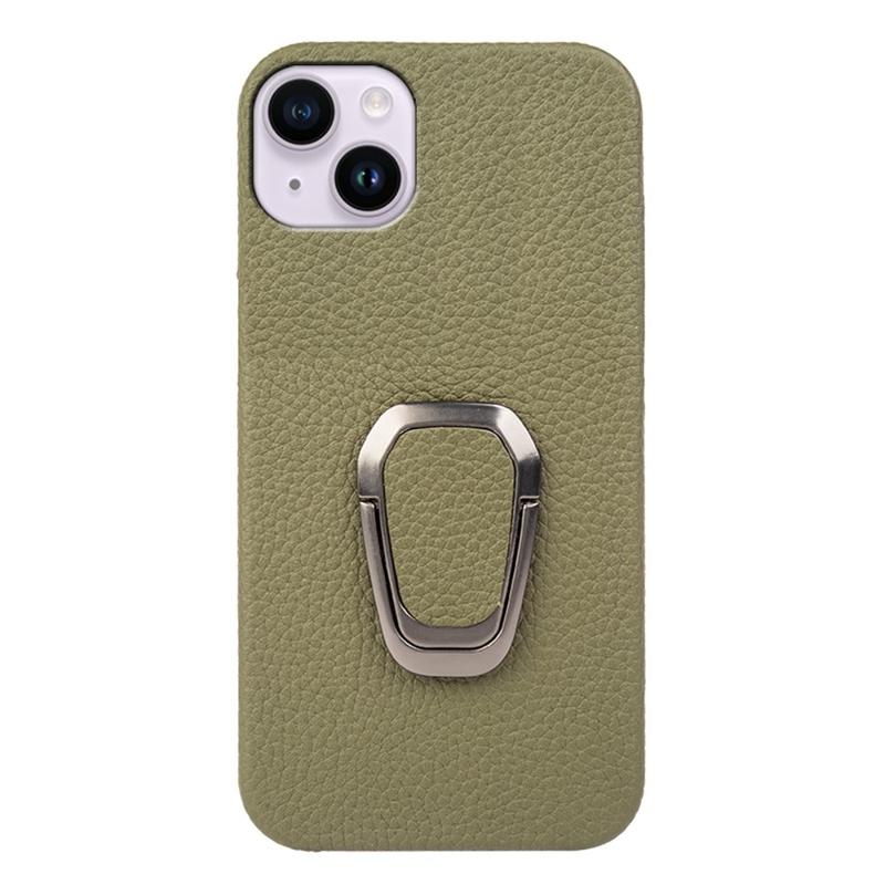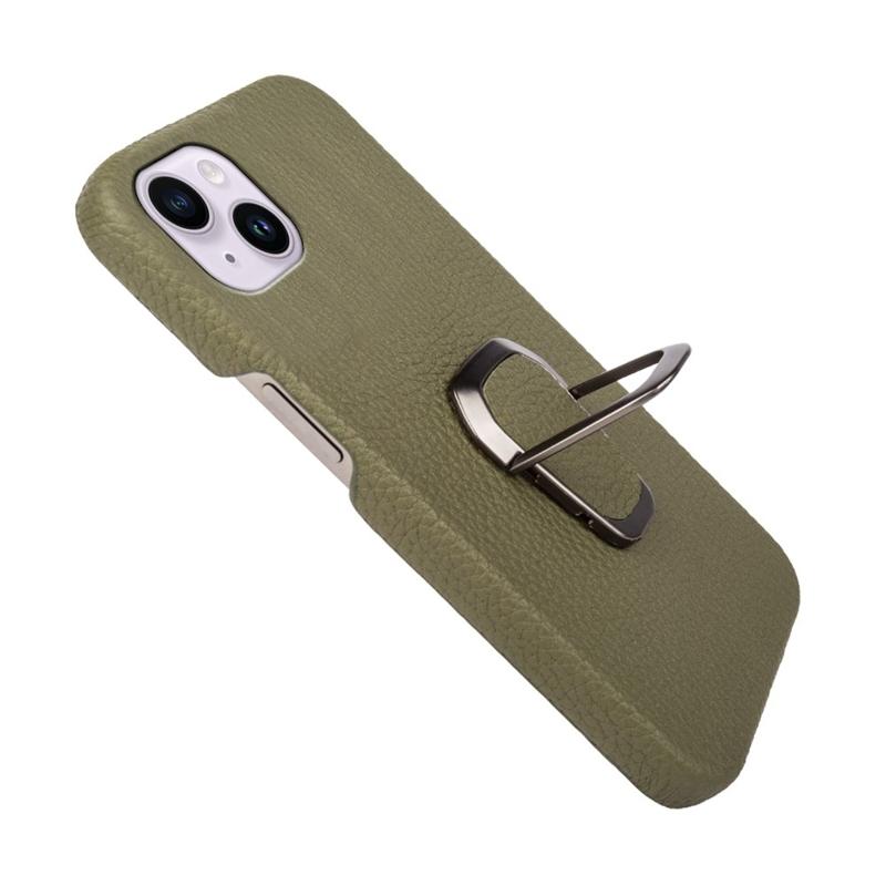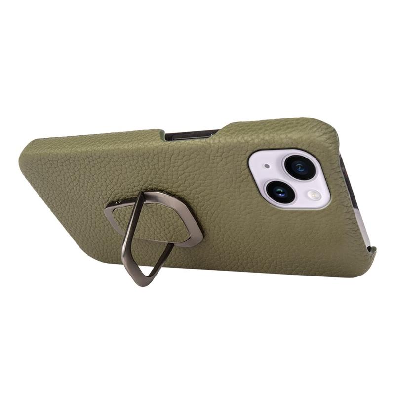 For iPhone 14 Plus Genuine Leather Coated PC Protective Phone Cover Ring Holder Kickstand Design Litchi Texture Non-Slip Shockproof Case