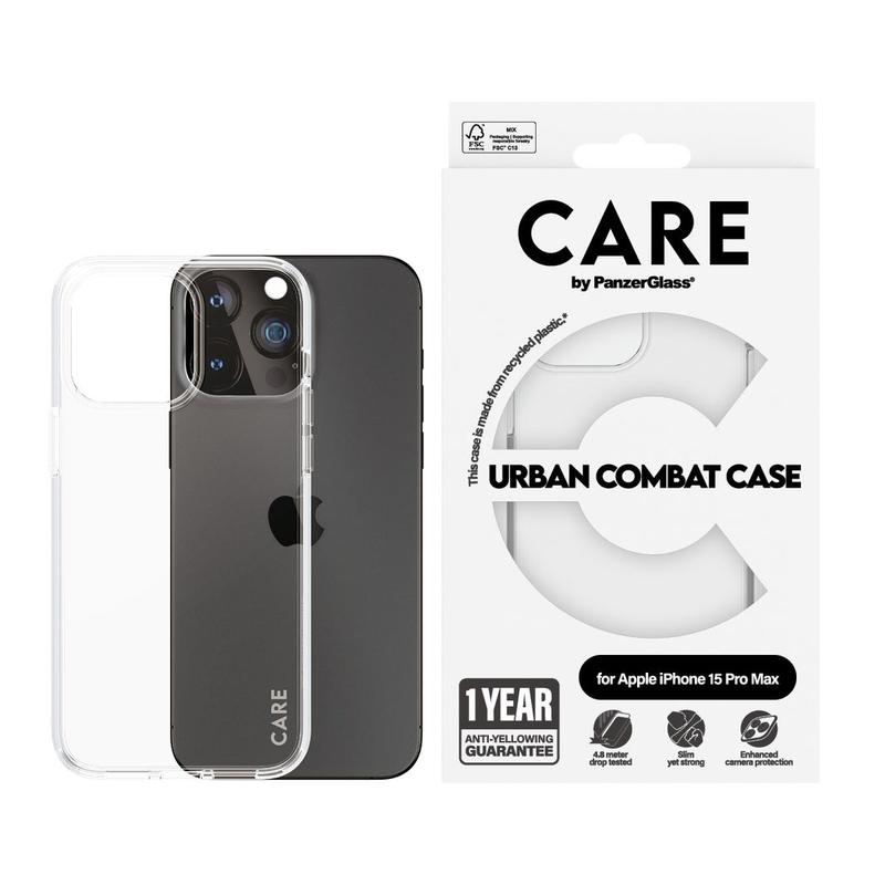 The CARE by PanzerGlass Flagship Case for iPhone 15 Pro Max Urban Combat with Clear Frame is designed for those who need robust protection without sacrificing style. Made from 100% recycled plastic, this case is built to withstand drops up to 4.8 meters and offers enhanced scratch and shock resistance. It is also compatible with wireless charging and comes with a 1-year anti-yellowing guarantee.