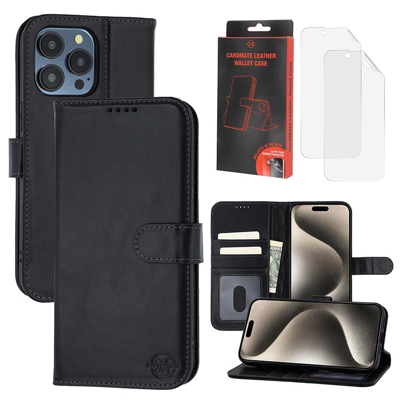 • MyTPhone CardMate Premium Leather Wallet Case for iPhone 15 Pro - Stand Feature, Card Holder, Wireless Charging Support, 2x Screen Protector