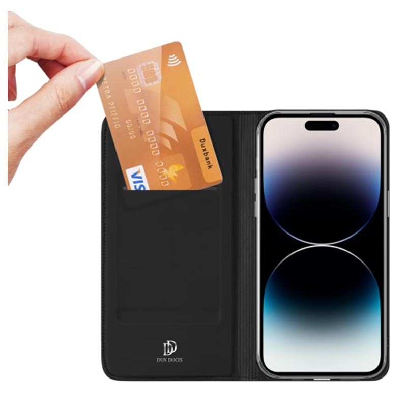 Ova Dux Ducis Skin Pro flip futrola za iPhone 15 Pro uređaj nudi i pregradu za karticu kao i praktičnu funkciju postolja.