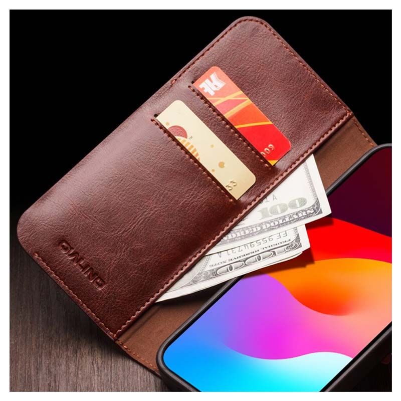 Napravljena od kvalitetne goveđe kože, Qialino Classic kožna novčanik-futrola za iPhone 15 Pro Max daje vašem uređaju moderan i elegantan izgled, dok ga istovremeno štiti od svakodnevnih oštećenja. Novčanik-futrola ima unutrašnje pregrade za držanje kartica i novca.