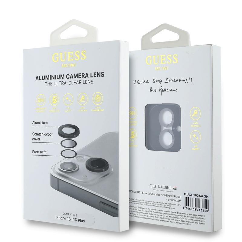 Enhance your iPhone 16, iPhone 16 Plus with the Guess Aluminium Camera Lens Protector. Designed for superior protection and style, this metal lens cover shields the entire camera system from scratches and abrasions while adding a sleek, premium finish. With a subtle Guess logo on the side, this lens protector blends functionality with the brand's signature elegance.