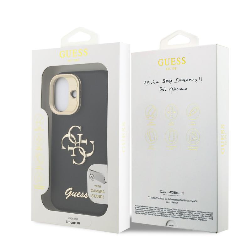Guess Grained 4G Logo Stand Camera Frame Case for iPhone 16 - Designer Style with Hands-Free Ease