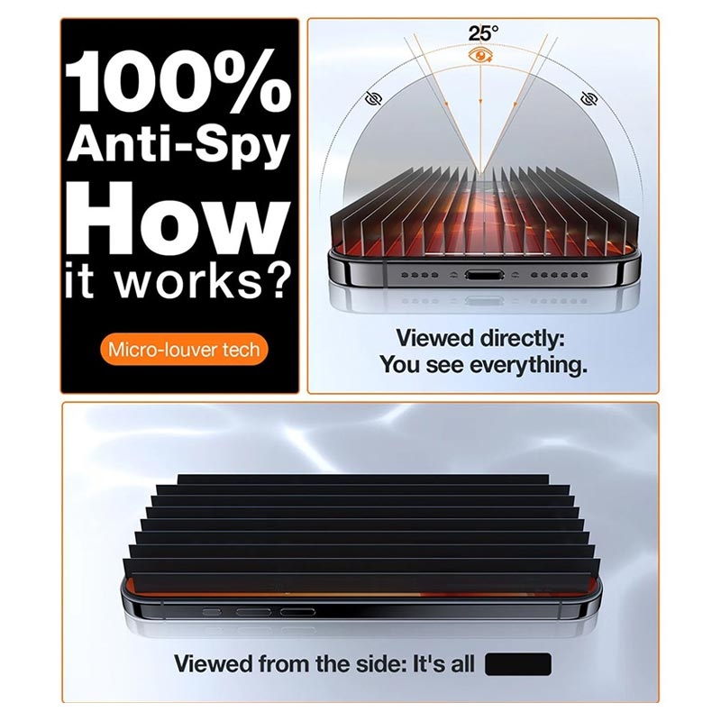 - Anti-Spy Technology: Blocks side views, ensuring your screen remains visible only to you, protecting sensitive information in public spaces.