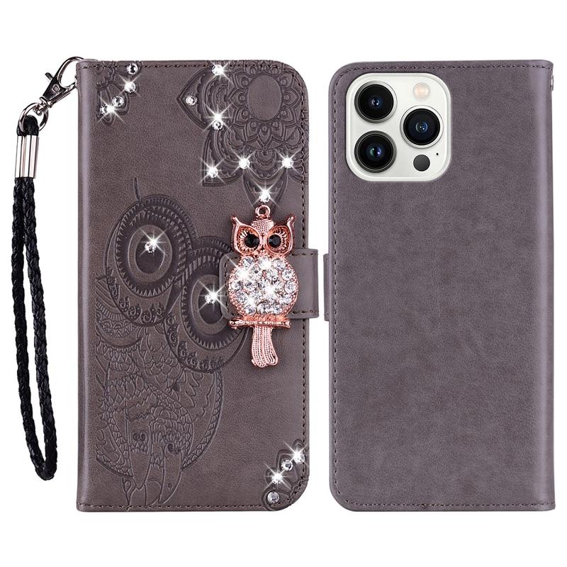 iPhone 16 Pro Max Owl Rhinestone Wallet Case - Grey