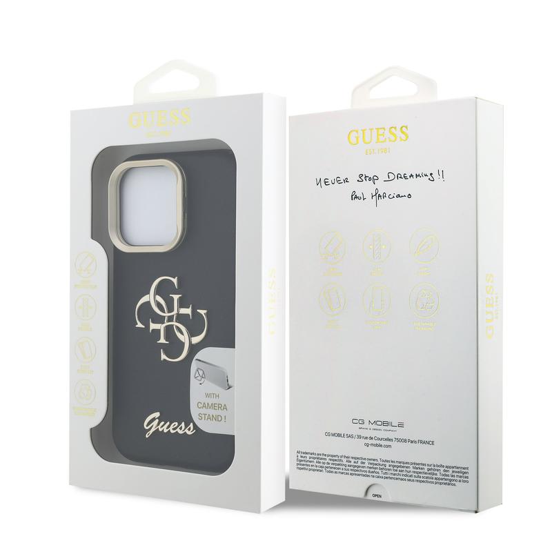 Guess Grained 4G Logo Stand Camera Frame Case for iPhone 16 Pro Max - Designer Style with Hands-Free Ease