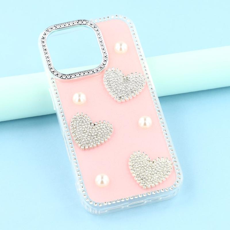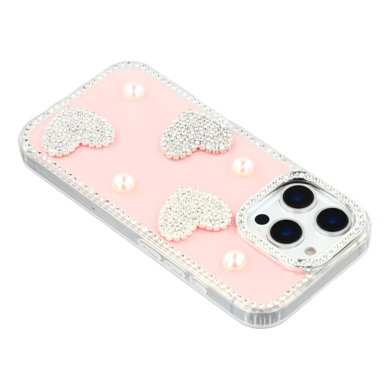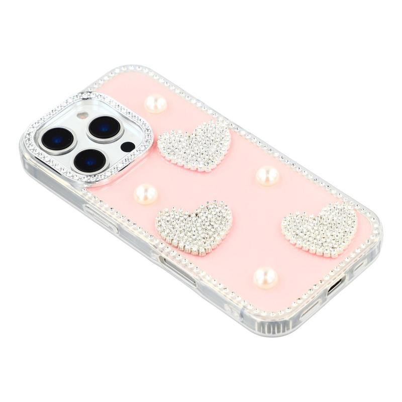 This iPhone 16 Pro Max case combines reliable everyday protection with glamorous style. Featuring shimmering rhinestones around the edges and sparkling pearl heart decorations on the back, it turns your iPhone 16 Pro Max into a fashionable accessory while keeping it safe from scratches and bumps.