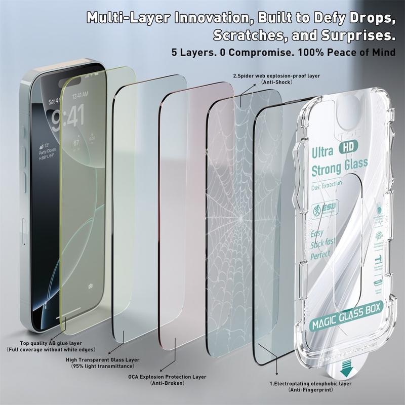 Keep your iPhone 16e, iPhone 14, iPhone 13 Pro, iPhone 13 safe with this high-definition tempered glass screen protector, designed to combine premium durability with effortless installation. The included automatic dust removal and edge-pressing tool ensures a bubble-free, perfect fit every time.