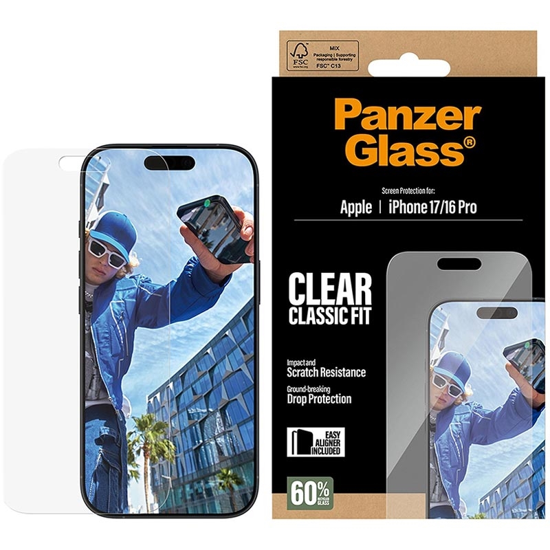 Shield your iPhone 17, iPhone 16 Pro with the PanzerGlass Classic Fit Screen Protector - built to withstand scratches, shocks, and crushing drops. Made of 60% recycled glass, it delivers the same uncompromising strength while contributing to a more sustainable future.