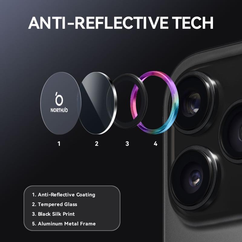 Upgrade your iPhone 17 Pro, iPhone 17 Pro Max with the Northjo camera lens protector. Featuring a CD veins aluminum ring, it adds a sleek, modern touch to your iPhone 17 Pro, iPhone 17 Pro Max while offering robust protection. The 9H tempered glass safeguards against scratches, impacts, and dust, ensuring your camera lens stays crystal clear. With easy, tool-free installation, you can enhance your iPhone 17 Pro, iPhone 17 Pro Max durability and aesthetics in seconds.