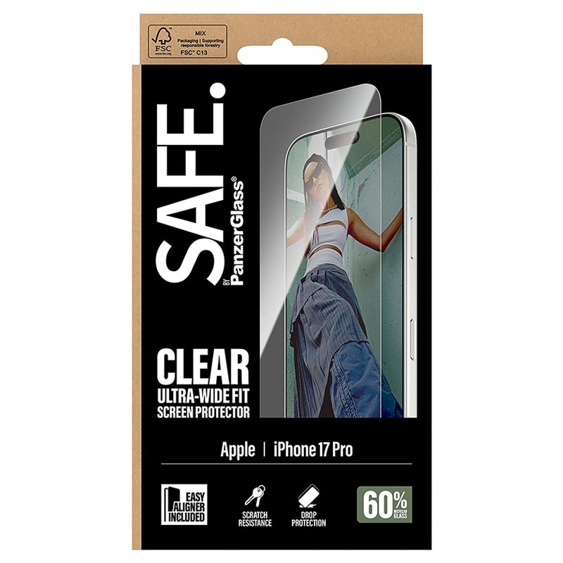 The SAFE. by PanzerGlass Screen Protector for iPhone 17 Pro offers superior protection with 60% recycled glass, safeguarding your device from drops, scratches, and shocks. Its ultra-wide fit ensures full coverage and clear screen visibility, while the fingerprint-resistant coating keeps your screen clean. With 100% touch sensitivity and easy installation using the included EasyAligner, this screen protector blends sustainability and functionality seamlessly.