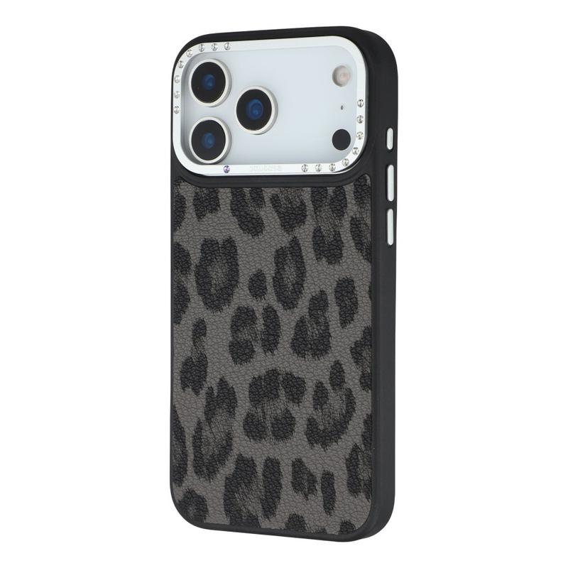 Jaucase Leopard Print Magnetic Hybrid Case for iPhone 17 Pro Max - PU + TPU + PC with Rhinestone Lens Frame