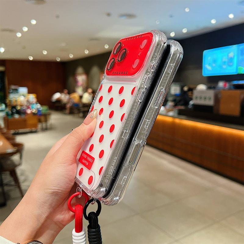 - Specifications – Material: TPU + PC | Compatibility: iPhone 17 Pro Max | Style: Transparent with polka dots | Accessories: Case + Lens Film + Strap.