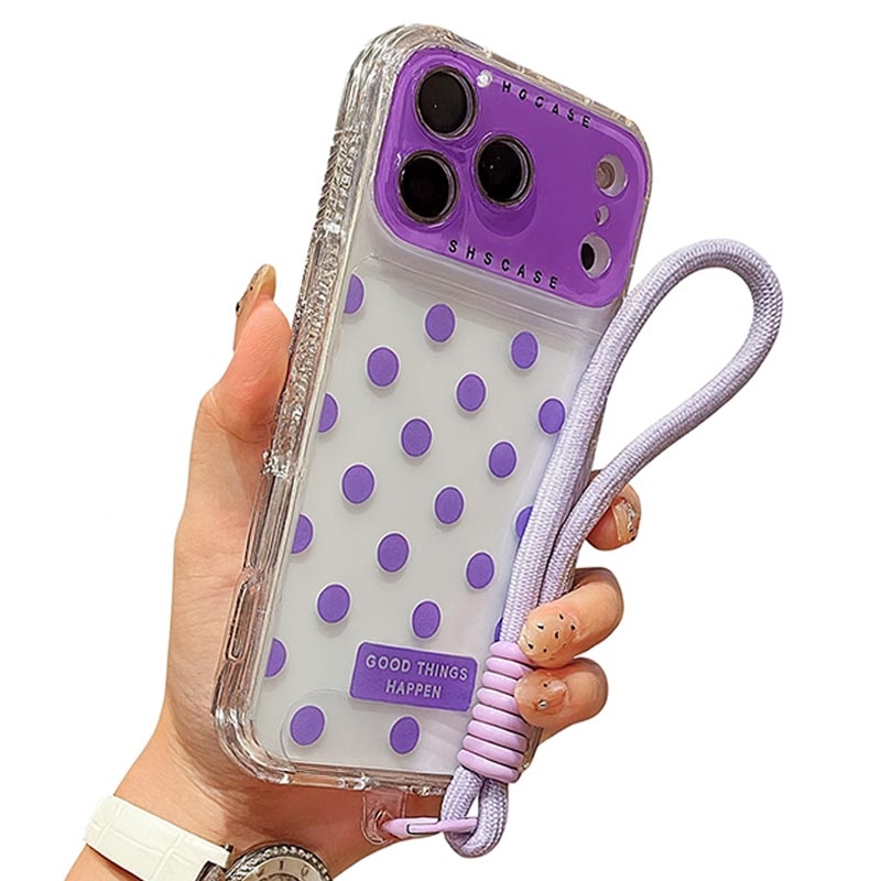 - Specifications – Material: TPU + PC | Compatibility: iPhone 17 Pro | Style: Transparent with polka dots | Accessories: Case + Lens Film + Strap.