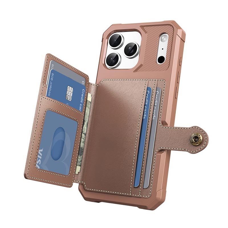 - iPhone 17 Pro Max maska sa novčanikom koji se zatvara pomoću kopče ima nekoliko pregrada za kartice i jedan džep za novac