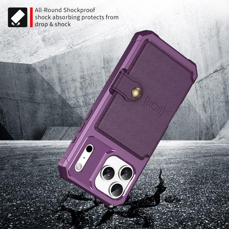 - iPhone 17 Pro maska sa novčanikom koji se zatvara pomoću kopče ima nekoliko pregrada za kartice i jedan džep za novac