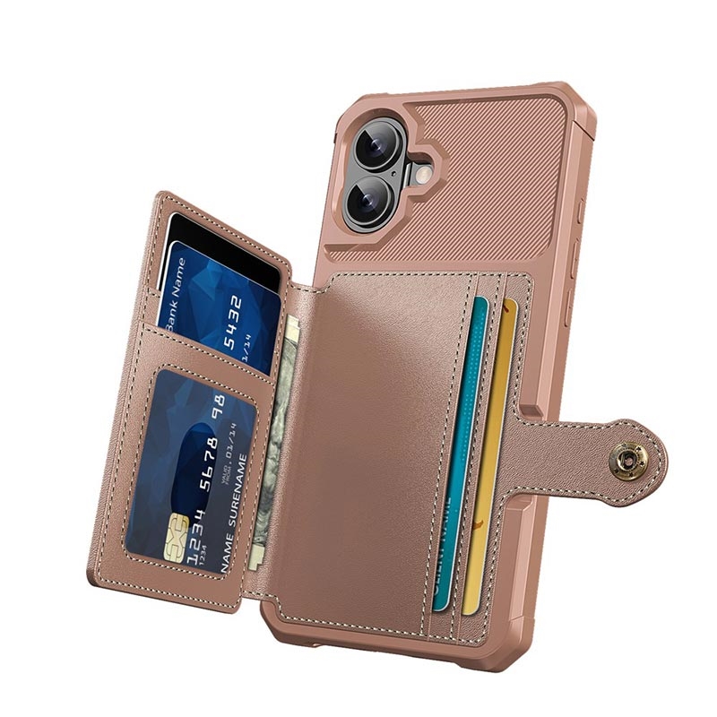 - iPhone 17 maska sa novčanikom koji se zatvara pomoću kopče ima nekoliko pregrada za kartice i jedan džep za novac