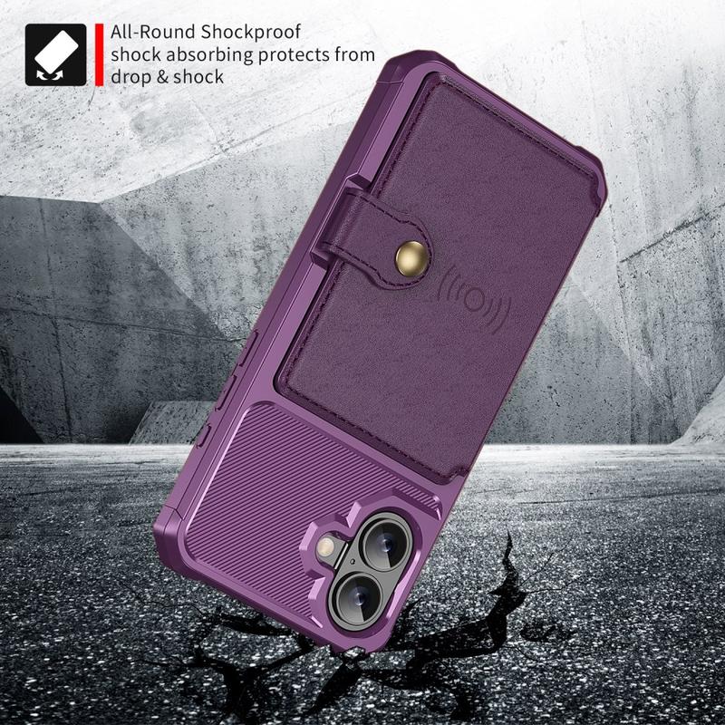 - iPhone 17 maska sa novčanikom koji se zatvara pomoću kopče ima nekoliko pregrada za kartice i jedan džep za novac