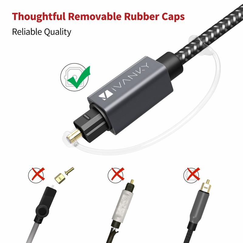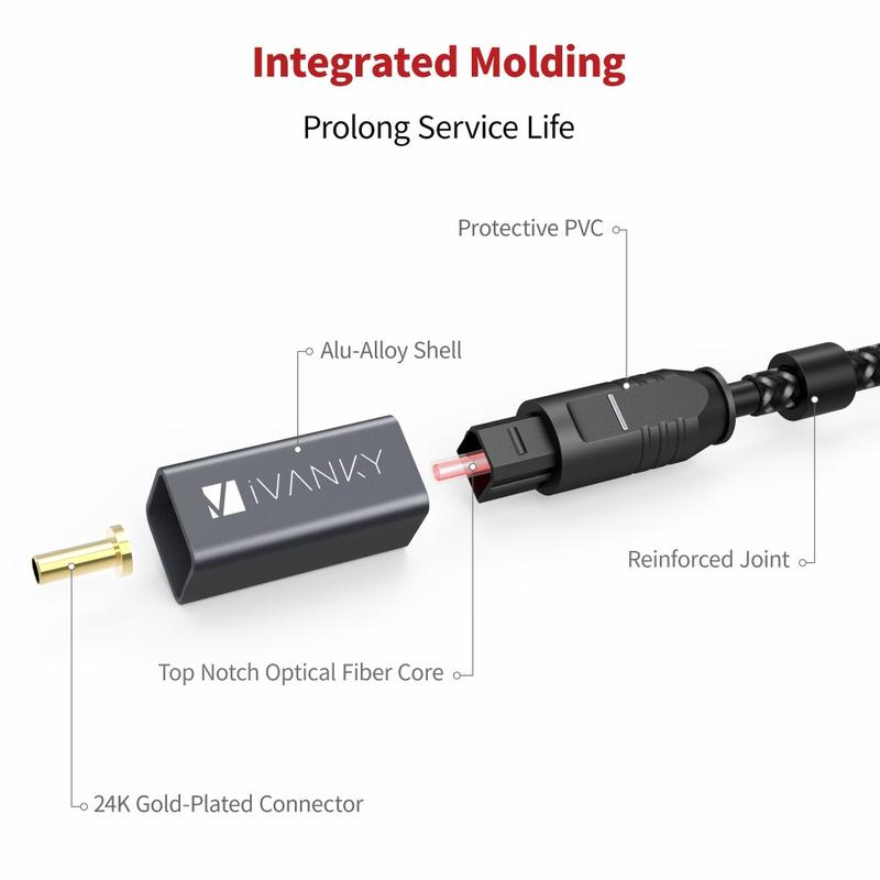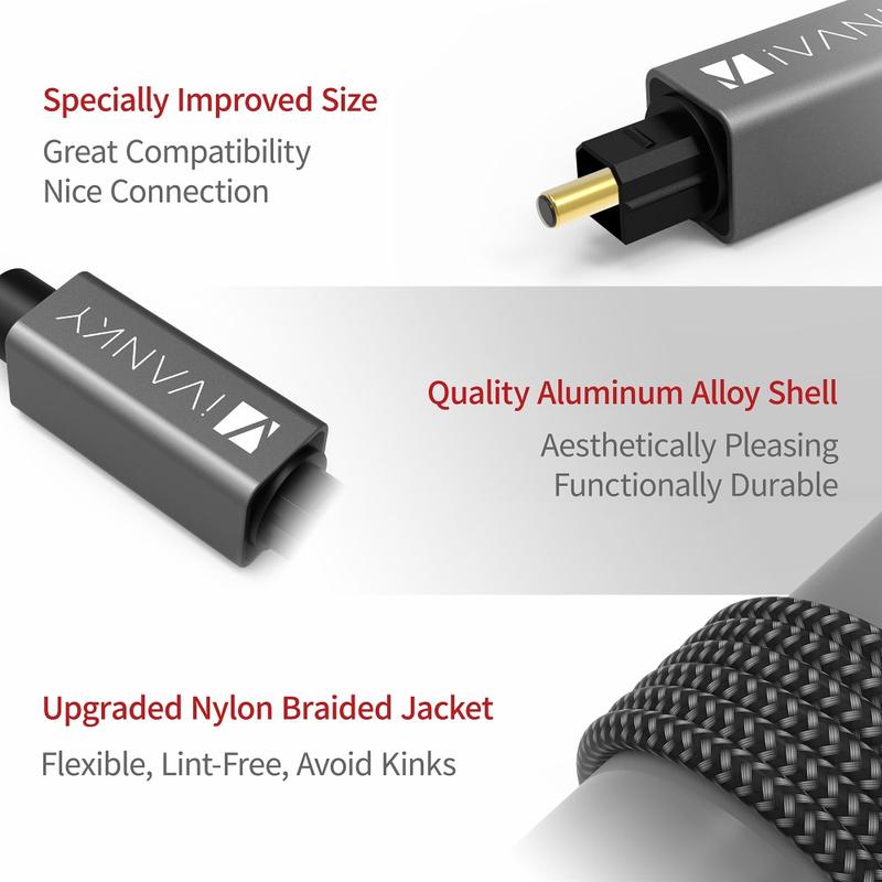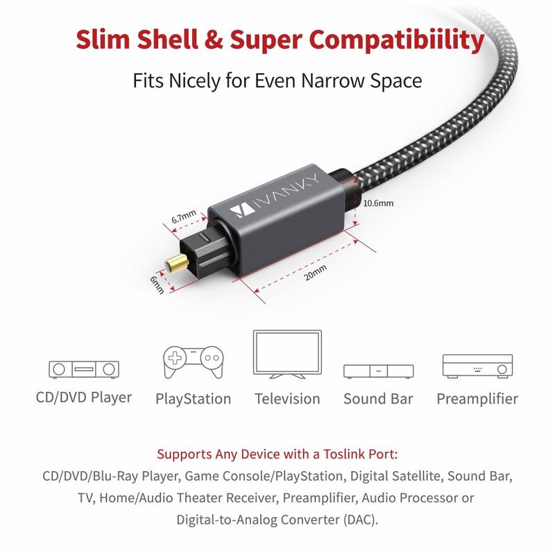 Enjoy clean, interference-free sound with the IVANKY OC03 Toslink optical audio cable. Built for reliable digital audio transmission, this 3 m fibre optic cable is ideal for connecting a TV to a soundbar, AV receiver, home cinema system, or game console. The slim connector shell fits neatly into tight spaces, while the aluminium alloy housing adds durability for everyday use. A flexible woven nylon braided jacket helps prevent tangles and kinks, and the included removable rubber caps protect the connectors when the cable isn’t in use. Simply plug in for a firm, stable connection and crisp digital audio.