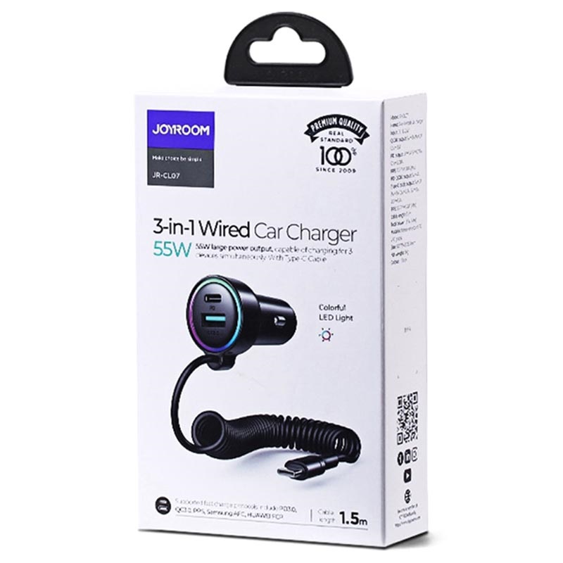 Joyroom JR-CL07 3-u-1 Žični Auto Punjač 55W - 1xUSB, 1xUSB-C, QC3.0, PD, PPS, AFC, FCP