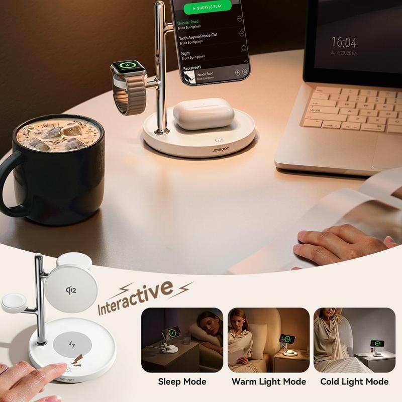 Meet your new bedside and desktop essential. The JR-W23 brings Qi2 fast charging to compatible phones (up to 15W), plus dedicated pads for earbuds (up to 5W) and smartwatches (up to 3W). The phone shelf tilts 0–36° for perfect portrait or landscape viewing, while the ambient lamp offers warm and cool tones via a responsive touch control. A fire-resistant ABS/PC housing with a premium zinc-alloy frame keeps everything sturdy, quiet and cool.