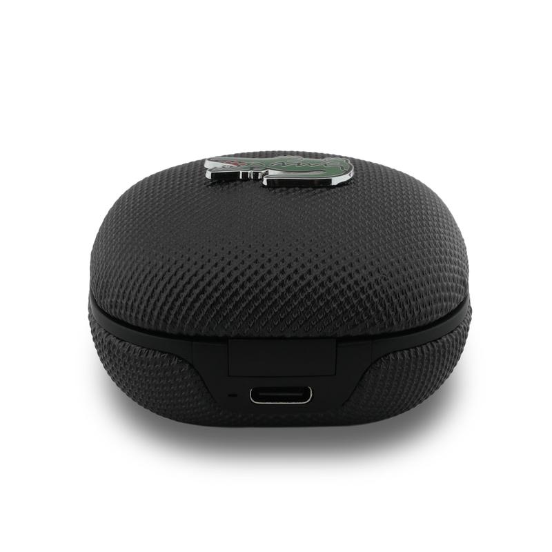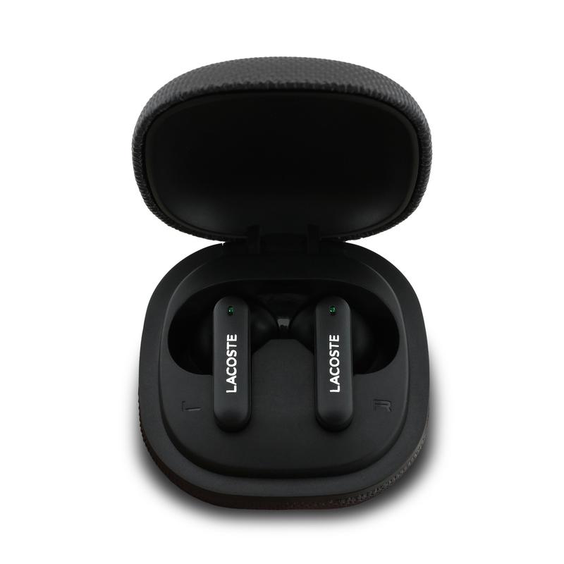 - Compact charging case with Lacoste branding