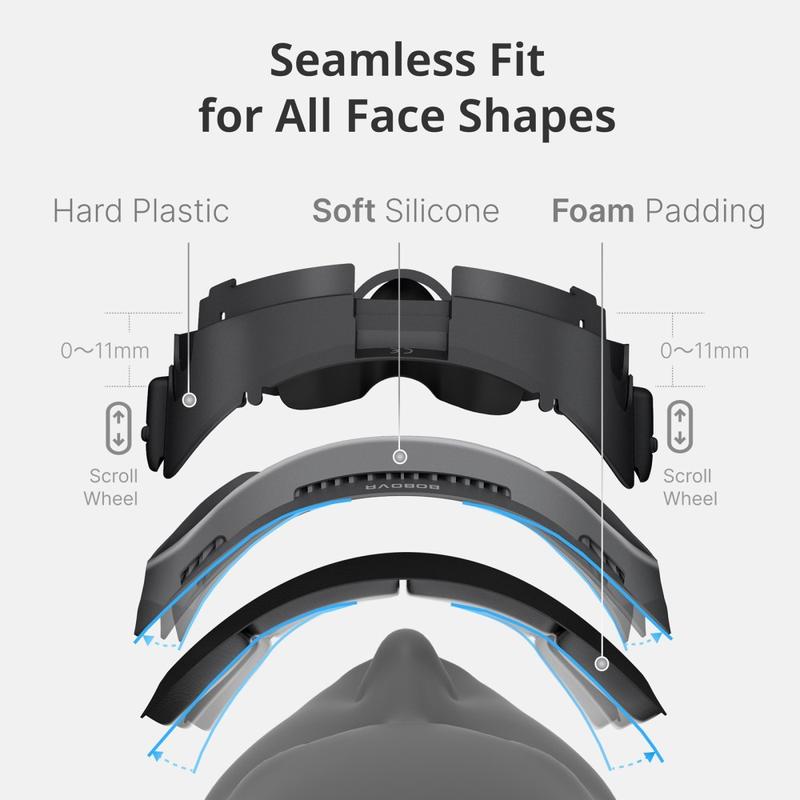 Compatible with all Meta Quest 3 head straps, this face mask adapts seamlessly to your headset. Its soft silicone padding contours naturally to different face shapes, ensuring a secure yet comfortable fit for every user.