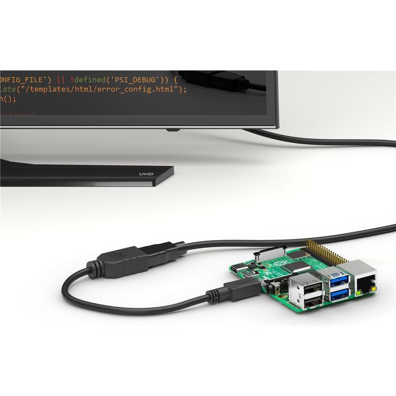 Flexibel och böjbar kort förlängning för anslutningar som är svåra att komma åt, t.ex. på baksidan av TV:n, HDMI™-adaptern integreras optimalt mellan enheten och anslutningskabeln för en stabil anslutning och hög komfort. Förlänger en HDMI™-kabel och är lämplig för att ansluta enheter med HDMI™-kontakt (Micro), t.ex. Raspberry Pi, GoPro-kameror, surfplattor samt för överföring från bärbar dator till TV. Signalöverföring med hög upplösning med upp till 4K @ 60 Hz (2160p), Micro-HDMI™-adapterkabel för alla vanliga funktioner som ARC, Ethernet kanal (HEC) och 3D-innehåll, Guldpläterade HDMI™-kontakter och avancerad teknik garanterar felfri signalöverföring, klart ljud och skarp video- och bildkvalitet.