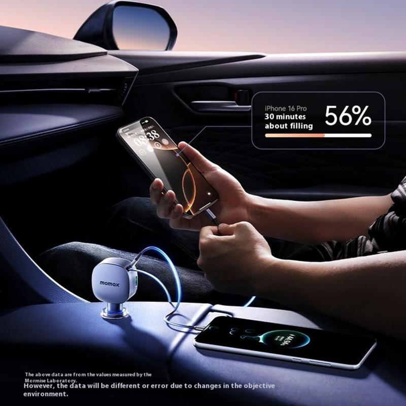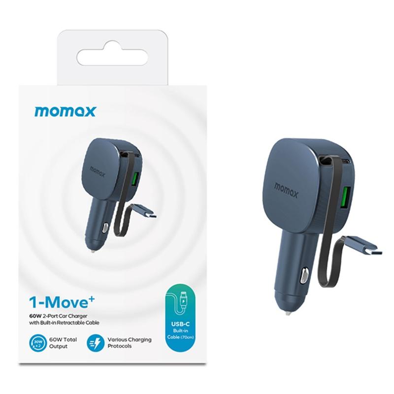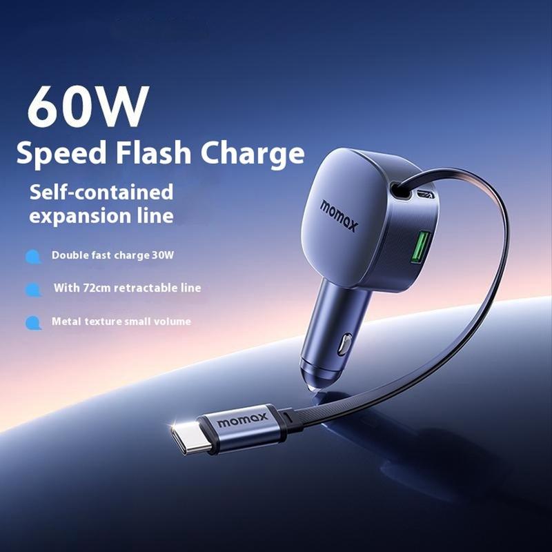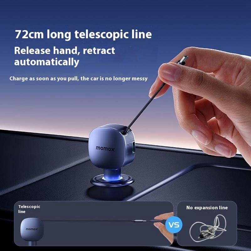 Momax 60W Car Charger - Retractable 30 W USB-C Cable + 30 W USB-C Port + 24 W USB-A Fast-Charge Adapter