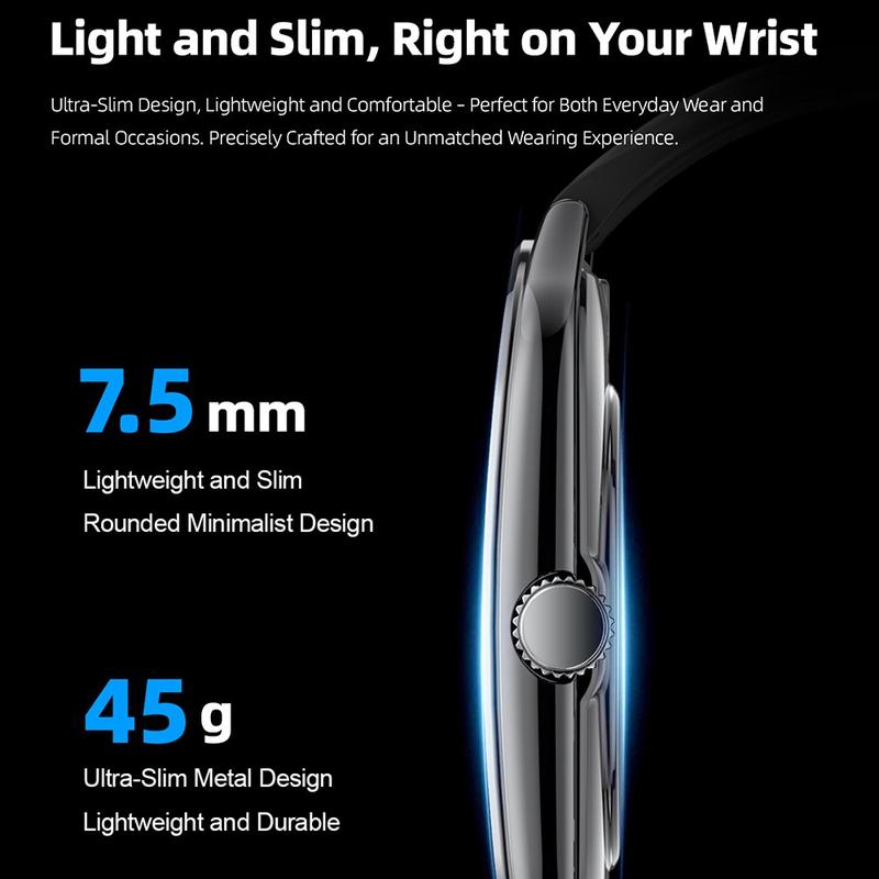 - 7.5 mm ultra-slim body, total weight only 45 g (0.045 kg) for day-long comfort