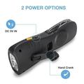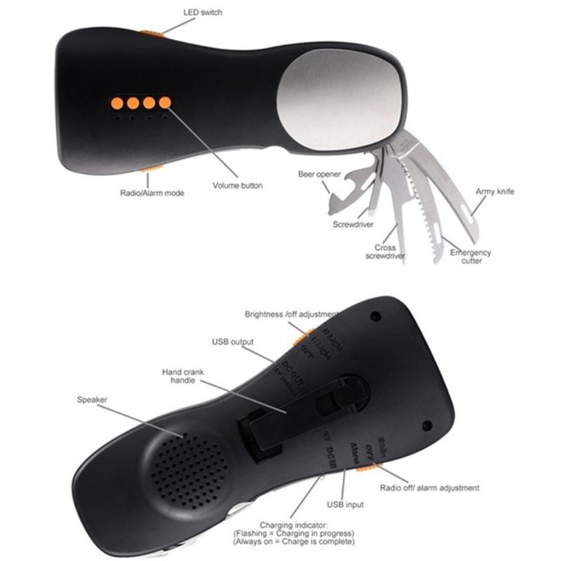 - Hand crank for 3 minutes provides 15-20 minutes of light, 10 minutes of alarm function, and 5 minutes of radio use